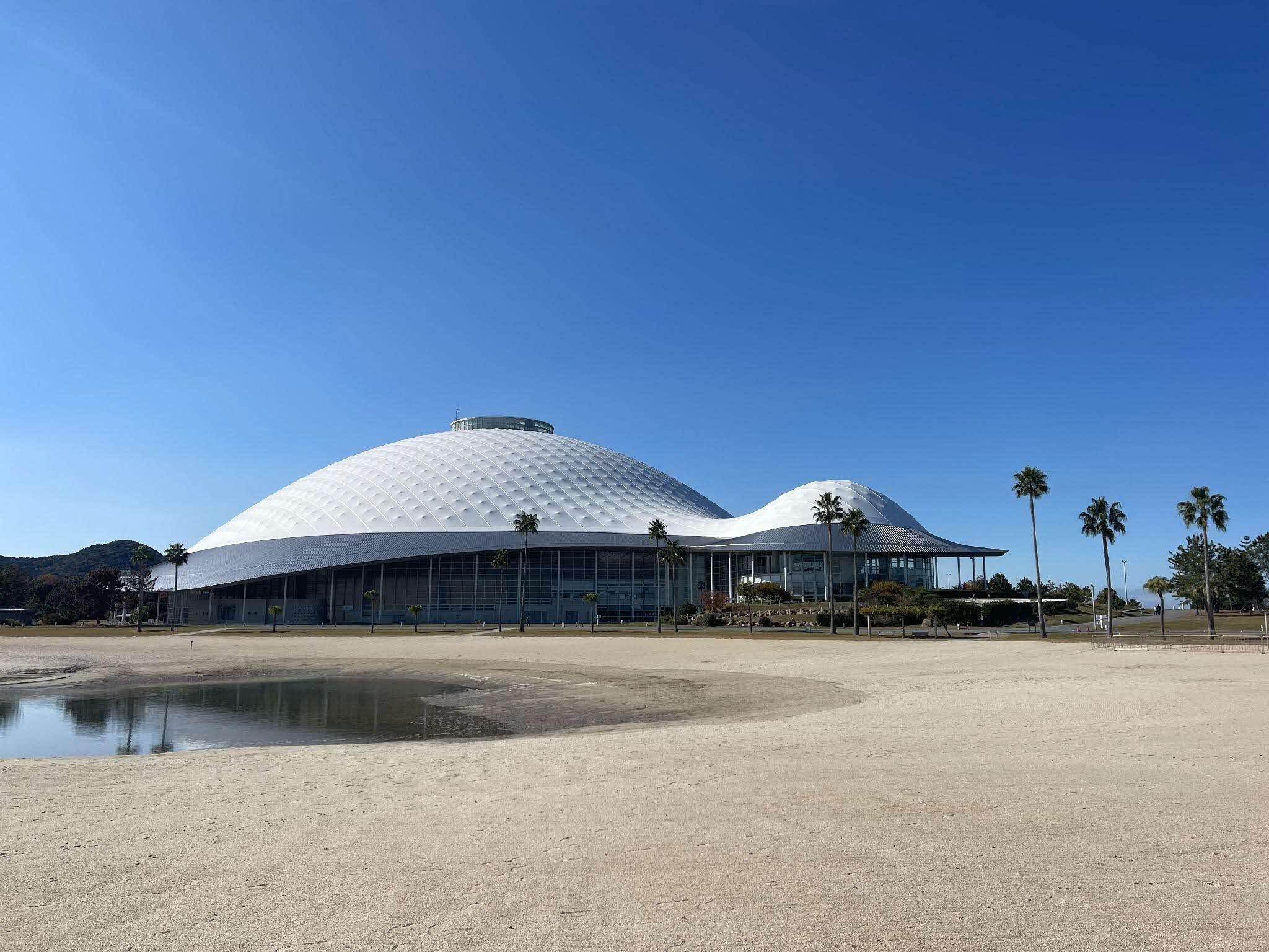 今回のツアーの拠点となったのは、山口県山口市にある「山口きらら博記念公園」です。 広大な敷地には、ビーチやアスレチックがある公園が広がり、白いドーム型の、野球もできる人工芝の多目的施設まで併設されています。ドームの裏には、穏やかな瀬戸内海が広がっており、夏にはSUPやカヌーなどのマリンスポーツも楽しめる場所です。子育て中の親なら、誰もがここで、子どもたちを思いっきり遊ばせたい!と思うでしょう。