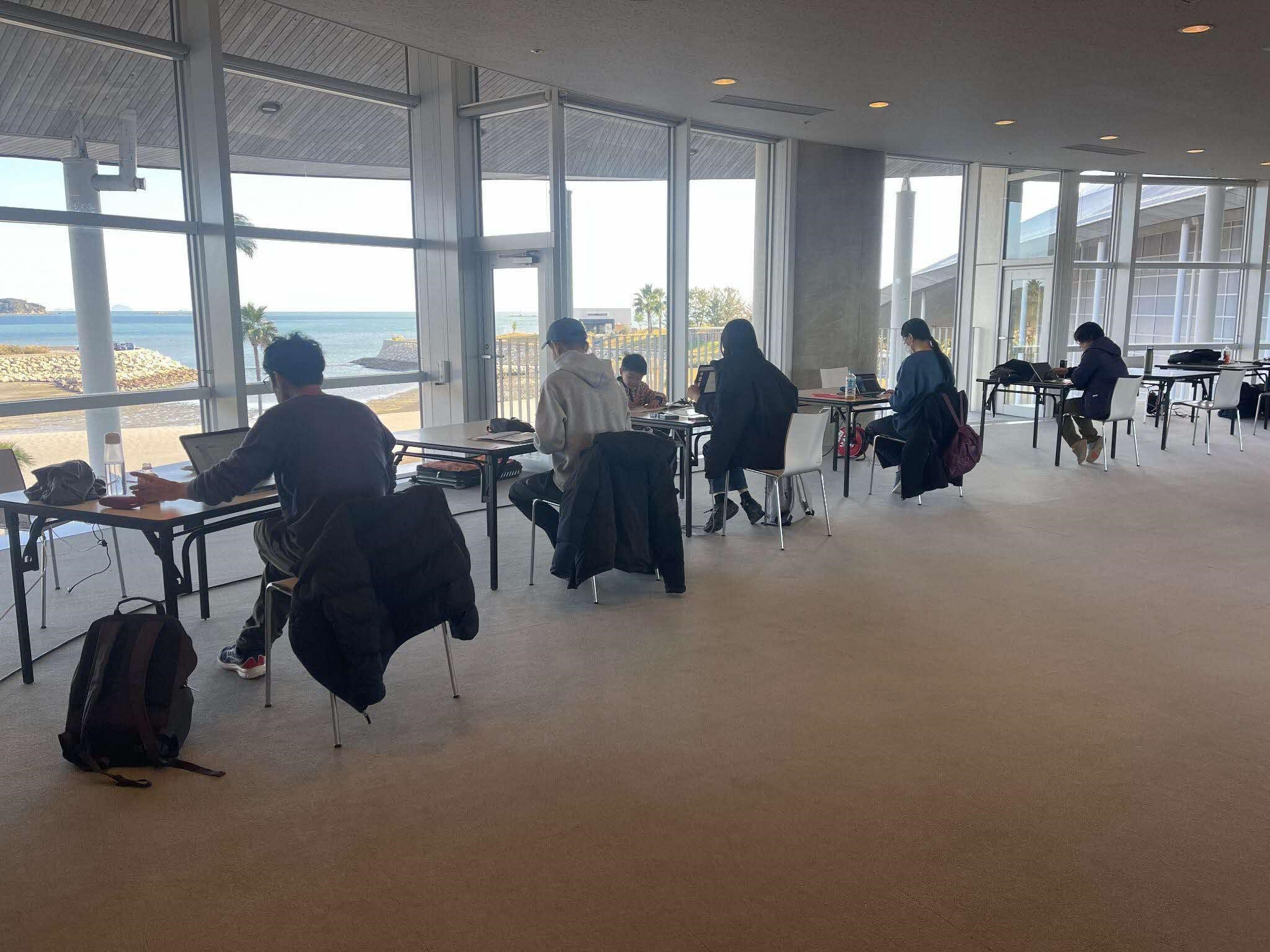 「海に囲まれていて驚きました。施設も広くて、景色も最高」「3面ガラス張りで開放感がすごい。普段、家で仕事をしているときは閉塞感があるけれど、ここは眩しいくらいの光が入ってきて、気持ちよく仕事ができました」と見晴らしに満足した様子。