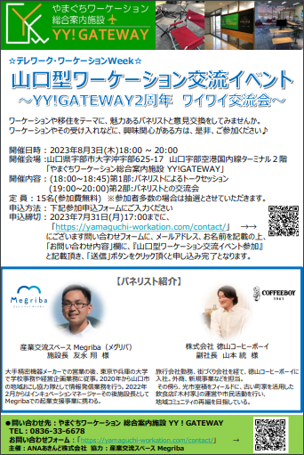 8/3(木)18:00~『山口型ワーケーション交流イベント~YY!GATEWAY2週年 ワイワイ交流会~』を開催します。