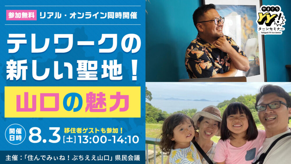 関東から山口県へ移住して、東京の会社に勤めながら山口でテレワークを実践する二人の移住者ゲストをお呼びして、移住前後で変化した暮らしや仕事、趣味についてのことや、山口テレワークの充実具合など実体験を元にお話しいただき、山口県でのテレワークの魅力をリアルにお伝えします!